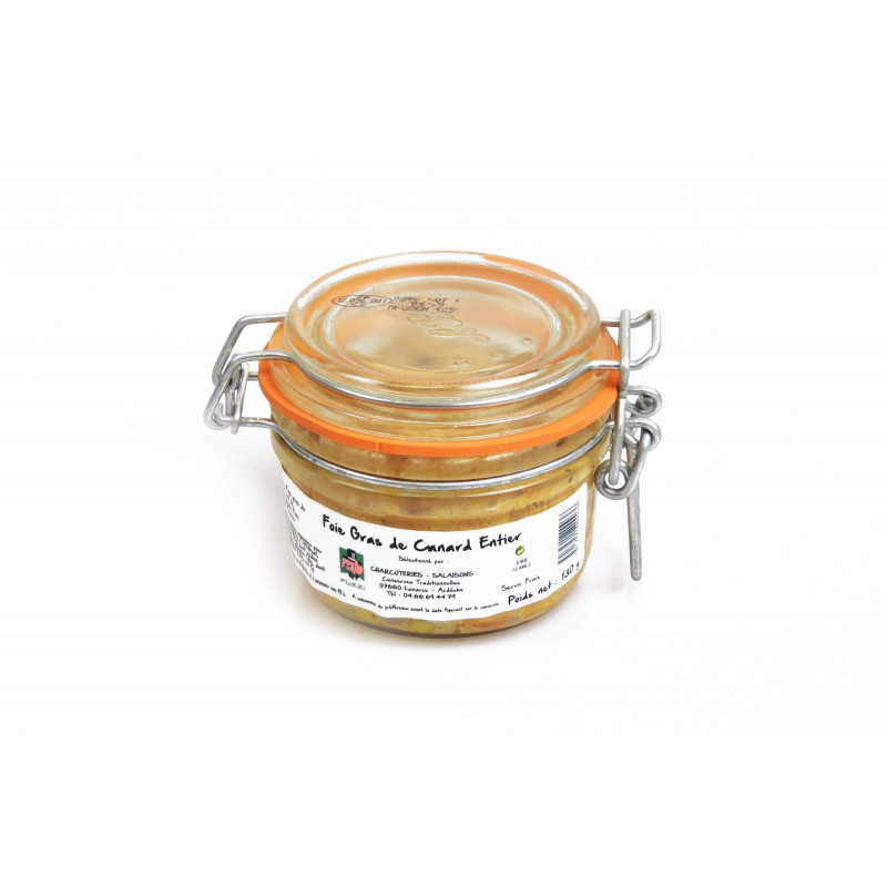 Foie gras de canard entier : préparation composée de un ou plusieurs lobes de foie gras de canard. Foie gras origine France Ingrédients : Foie gras de canard origine : France, sel, sel de Guérande, poivre. Absence d’OGM – absence d’ionisation – absence d’allergènes Température de conservation : Température ambiante – endroit sec Après ouverture à conserver au réfrigérateur et à consommer sous 48h |